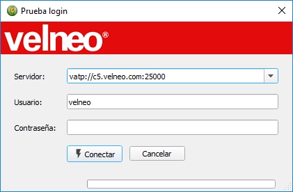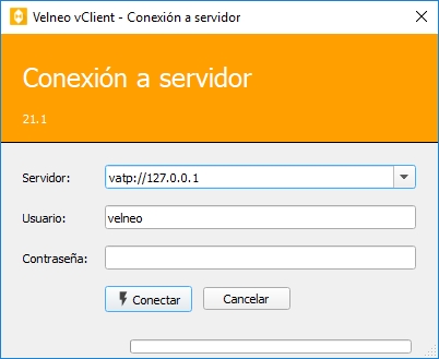 Cuando ejecutamos Velneo vClient, se presenta la ventana de conexión con Velneo vServer: