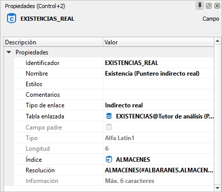 Este enlace se utiliza para relacionar la tabla de datos actual con otra tabla que no es maestra de la actual y que se elige en la propiedad Tabla enlazada . En este caso, desde una línea de albarán queremos actualizar la existencia, por lo que seleccionamos la tabla Existencias.