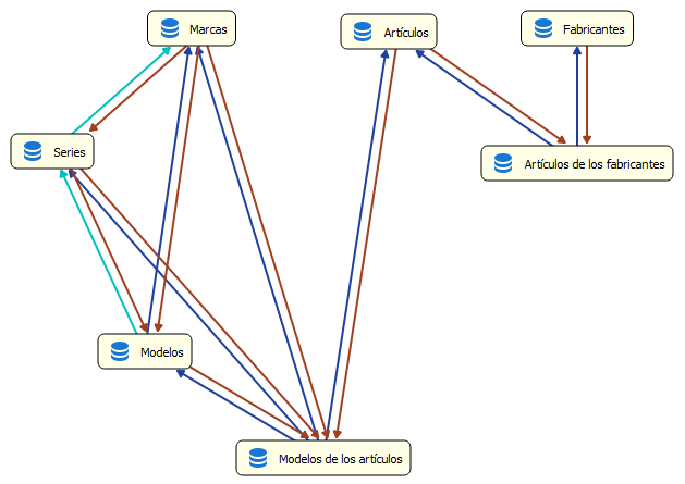 Al crear las tablas, se crean directamente los enlaces entre ellas por haber definido SERIES y MODELOS como submaestras: SERIES será plural de MARCAS, mientras que MODELOS será plural tanto de SERIES como de MARCAS.