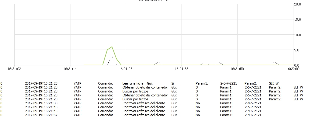 Esta opción nos permite monitorizar las peticiones que Velneo vClient hace a Velneo vServer durante la ejecución de una aplicación. Informa sobre cada una de las conexiones (sockets) que realiza Velneo vClient con Velneo vServer por segundo, detallando la información de cada una de ellas.