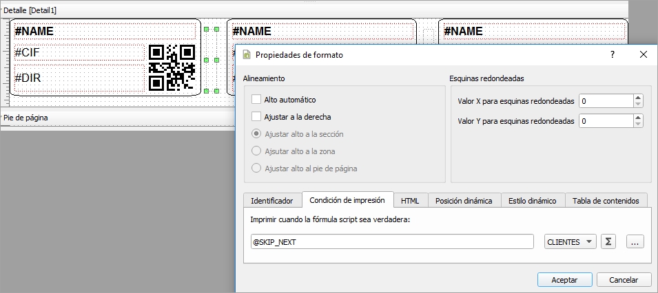 Debemos tener en cuenta que cuando usamos la condición @SKIP_NEXT para el salto de registro en el detalle y en la última línea, en el caso de que no se completen los registros, se repite el último registro en aquellas etiquetas que deberían quedar vacías al no tener más registros que imprimir.