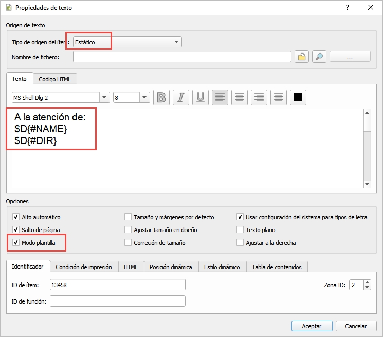 En ejecución se realizará la sustitución del contenido de un control por el resultado de la fórmula del tipo $P{} ó $D{}. De esta forma obtenemos texto continuo que incluye valores dinámicos, permitiéndonos definir informes del tipo combinar correspondencia para cartas, u otros documentos personalizados.