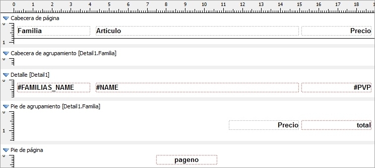 Tras añadir el campo, añadiremos alguna etiqueta más al informe y moveremos el campo #FAMILIAS.NAME a la sección de cabecera del agrupamiento: