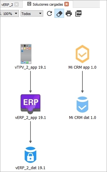En el caso de que hayamos creado también algún proyecto, éste será cargado automáticamente. En el panel central de Velneo vDevelop se muestra el esquema de los proyectos de la solución cargada y las relaciones entre ellos: