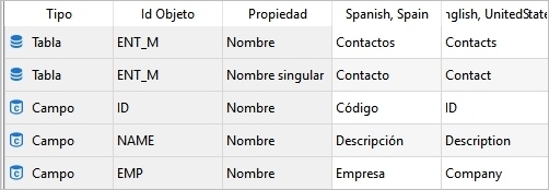 En el panel principal, como ya comentamos anteriormente, se muestra la lista de recursos traducibles. Las primeras columnas muestran información sobre el objeto o sub-objeto (Tipo, Id. objeto y propiedad) y las últimas el nombre dado al objeto en cada uno de los idiomas que hayan sido declarados en el proyecto. La columna correspondiente al primer idioma será la del idioma principal del proyecto.