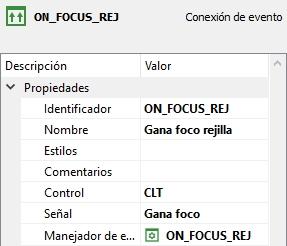 Hemos creado varios manejadores de evento de ganancia de foco, uno por cada control del formulario (rejilla, botón, control de edición y control de mensajes). Explicaremos solamente uno de ellos, pues todos se programan igual. Lo explicaremos con la rejilla. Se ha creado el manejador de evento llamado ON_FOCUS_REJ: