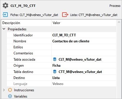 Un proceso o una búsqueda que devuelva los contactos del cliente del formulario. En este caso hemos optado por un proceso. Dado que el proceso se va disparar desde un formulario de Clientes, el proceso tendrá origen ficha y la tabla asociada será la tabla de clientes (CLT_M). En el proceso vamos a obtener los contactos de ese cliente, por lo que el destino del proceso será una lista de la tabla de contactos (CTT_M):