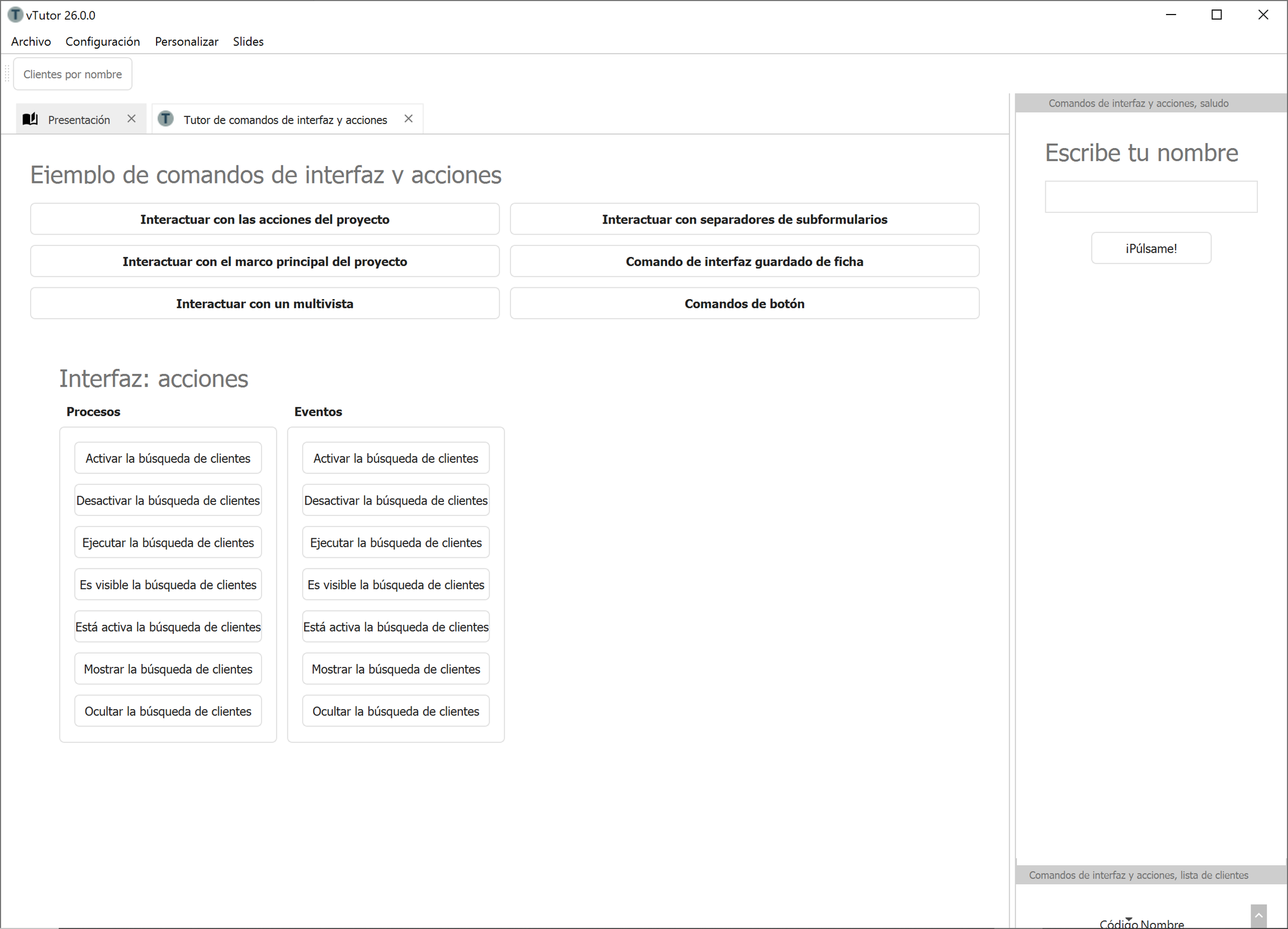 En este caso todos ellos actuarán sobre la acción clientes por nombre de la toolbar que se activa cuando ejecutamos el tutor.