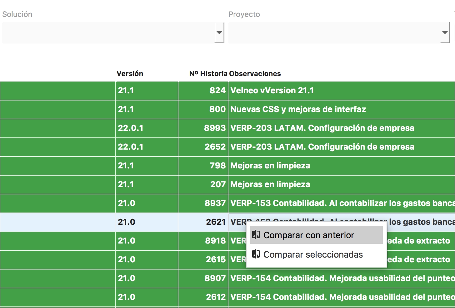 Compara con la versión anterior en un clic, seleccionando cualquier proyecto y pulsando la opción "Comparar con versión anterior". Se compara el proyecto con la versión anterior del mismo proyecto que existe en el servidor, independientemente de que desarrollador la haya guardado.