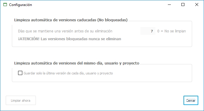 Entre las opciones del menú general se encuentra la opción config. de limpieza. En el formulario que se abre, si pulsamos el botón limpiar ahora, eliminará las versiones guardadas en el repositorio desde el pasado hasta el día que indiquemos. Sin embargo, aquellas versiones que hayamos configurado para Bloquear, no serán eliminadas y permanecerán en el repositorio hasta que se eliminen o bien manualmente o bien cambiando la configuración de bloquear previamente a lanzar de nuevo esta tarea.
