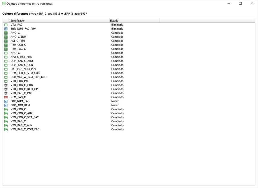 Entre las opciones del listado de versiones se encuentra comparar versiones, es decir, mostrar un listado con los cambios existentes entre los objetos de un proyecto y otro. Podemos acceder a esta utilidad desde la toolbar del listado o con el menú contextual, teniendo disponible la posibilidad de comparar dos proyectos seleccionados o un proyecto con la versión anterior del mismo. Indica qué objetos han sido creados, eliminados y modificados. Al comparar se muestra el listado de cambios y haciendo doble clic sobre uno de los objetos se muestra de forma detallada los cambios de dicho objeto.