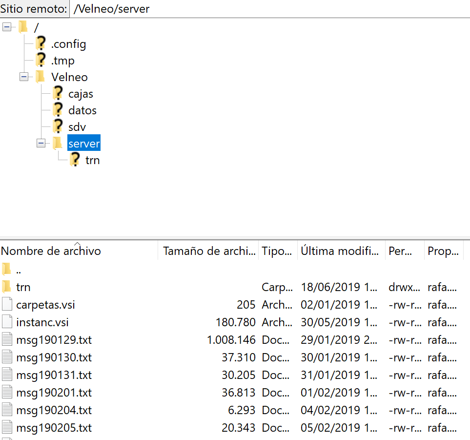 Si hay algún fichero dañado y no se informa de cuál es en los mensajes de Velneo vAdmin, entonces tendremos que ir quitando ficheros de la instancia e intentar arrancar el server hasta que arranque. Para ello debemos conectarnos vía sftp a nuestro servidor.