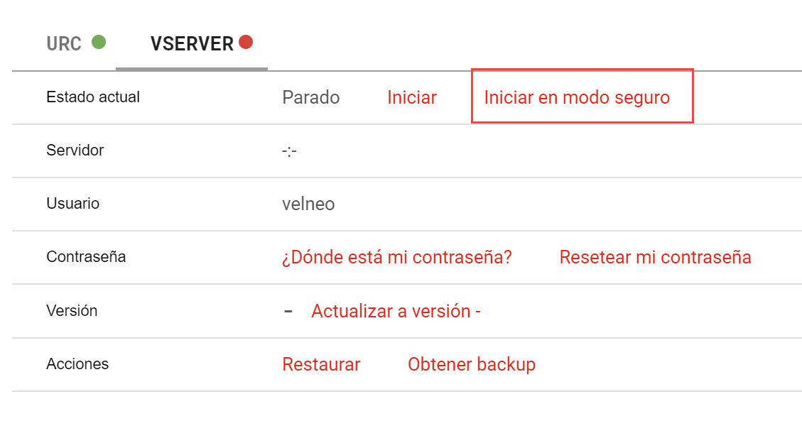 En ese caso lo primero que tenemos que hacer es intentar arrancarlo en modo seguro. Para ello debemos acceder a nuestro panel de control cloud y arrancar el servidor en modo seguro:
