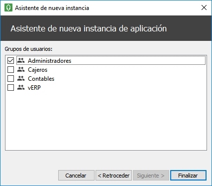 En el último paso el sistema pedirá que seleccionemos qué grupo de usuarios podrán ejecutar la nueva instancia que se genere: