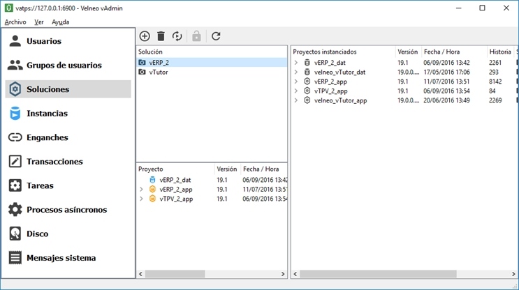 En esta pestaña tendremos acceso a las soluciones declaradas en Velneo vServer y los proyectos de datos y de objetos declaradas en las mismos.