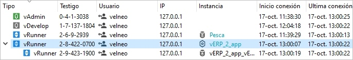 Los enganches a instancias correspondientes a clientes de ejecución Velneo vClient, Velneo vDataclient, etc.) serán mostrados de forma arbolada. El nodo principal del árbol será la instancia principal y las subramas serán las instancias heredadas.