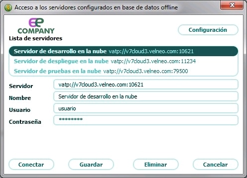Podemos personalizar el aspecto completo de la ventana de conexión de Velneo vClient por lo que podremos diseñar nuestra propia ventana de conexión partiendo de cero, con el aspecto, logos e información que nos interese presentar al usuario.