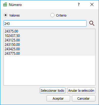 O escribir directamente el valor a buscar, en cuyo caso en la lista quedarán solamente los valores coincidentes con la cadena escrita y todos seleccionados: