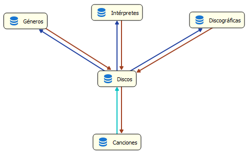 Por último, un disco contendrá varias canciones, mientras que una canción pertenecerá a un disco en exclusiva.