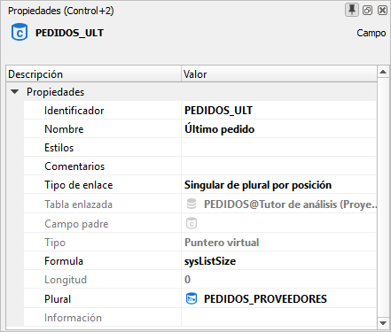 Comenzaremos por obtener el último pedido introducido independientemente de la fecha. Para ello, crearemos un nuevo campo y le asignaremos el tipo de enlace singular de plural por posición. Escogeremos el plural PEDIDOS_PROVEEDORES y definiremos la fórmula de resolución con la variable de sistema sysListSize, que nos devuelve la posición del último registro correspondiente al plural seleccionado, es decir, el último pedido dado de alta para el proveedor correspondiente. Este enlace nos permite mostrar cualquier dato del pedido en la ficha del proveedor.