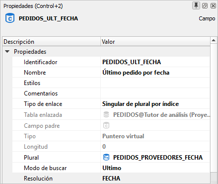 El plural para la resolución que debemos usar será el correspondiente al índice y aparecerá denominado como PEDIDOS_PROVEEDORES_FECHA. A la hora de resolver el índice usaremos la opción Último , lo que nos devolverá la última factura por fecha de ese proveedor. Al igual que en el caso anterior, este enlace nos permite mostrar cualquier dato del pedido correspondiente en la ficha del proveedor.