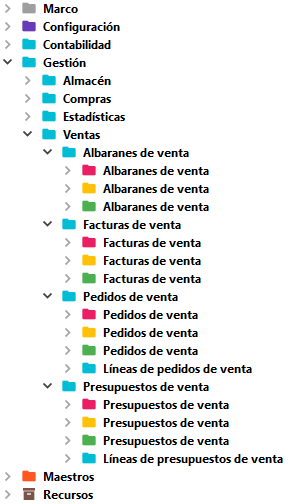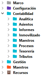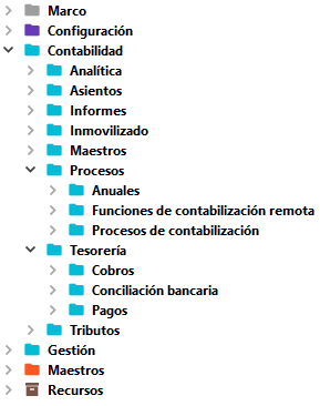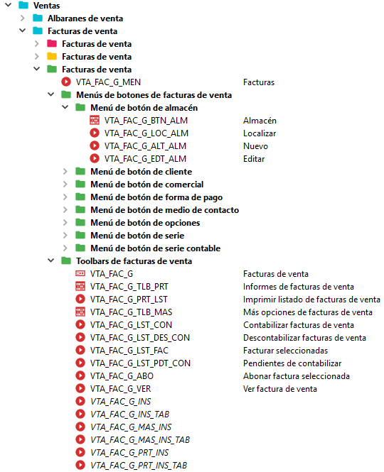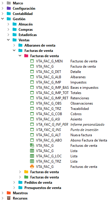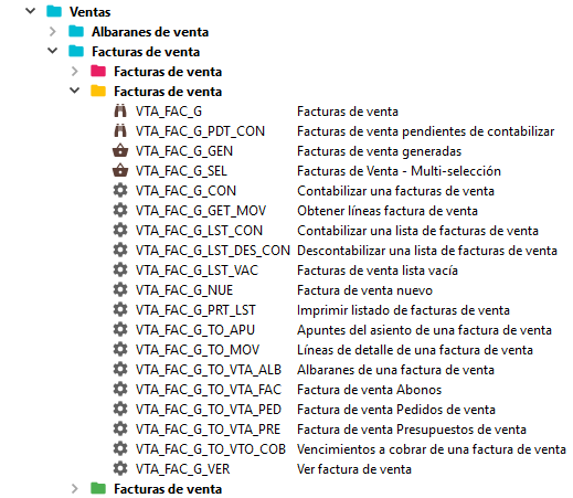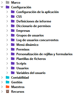 Cada de uno de los módulos dispondrá de una carpeta general y en su interior pueden darse 2 casos: crear subcarpetas con submódulos o crear subcarpetas por tabla. Este segundo caso se da con las tablas de configuración (icono Objetos 5)