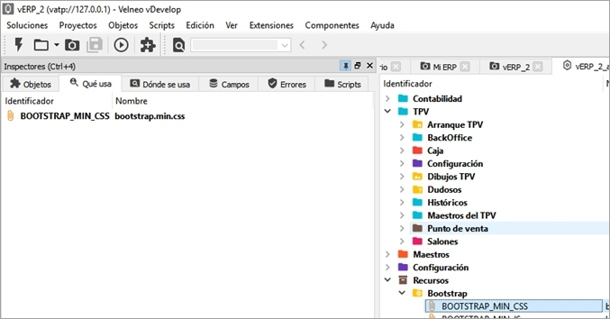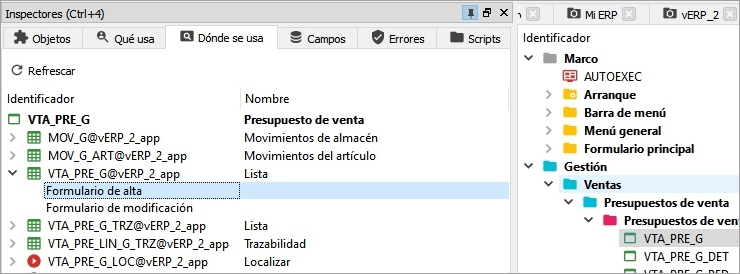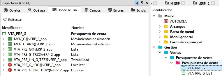 Por medio de este inspector, podremos conocer dónde es usado un objeto o un sub-objeto concreto. Para conocer dónde se usa un objeto o un sub-objeto concreto no tendremos más que seleccionarlo o bien en la pestaña Proyecto del panel central de Velneo vDevelop o bien desde cualquier otro inspector del panel de inspectores. Una vez hecho esto accederemos a la pestaña ¿Dónde se usa usa? del panel de inspectores y haremos clic en el botón "refrescar".