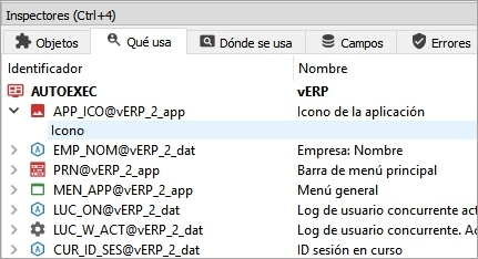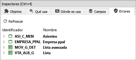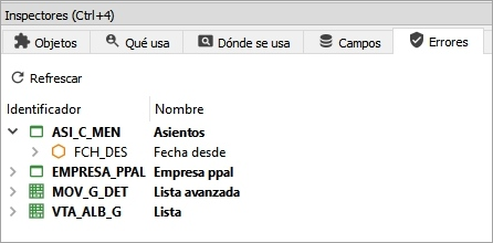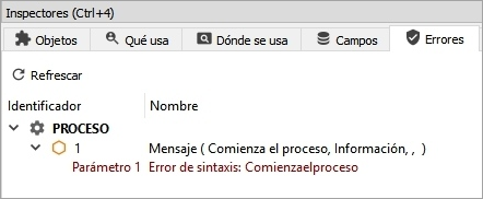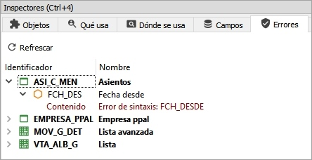 Por medio de este inspector, podremos localizar errores en identificadores de objetos y subobjetos usados como valores en propiedades de otros objetos y errores de sintaxis en fórmulas.