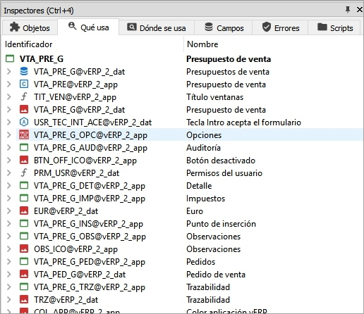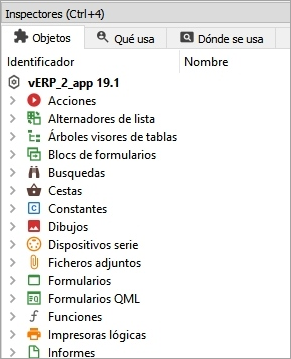 Por medio de este inspector, podremos conocer qué objetos o sub-objetos son usados por un objeto o subobjeto concreto. Para conocer qué objetos o sub-objetos usa un objeto concreto no tendremos más que seleccionar el objeto deseado o bien en la pestaña Proyecto del panel central de Velneo vDevelop o bien desde cualquier otro inspector del panel de inspectores. Una vez hecho esto accederemos a la pestaña ¿Qué usa? del panel de inspectores:
