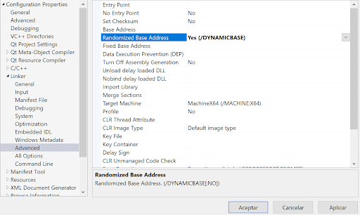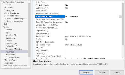 Debemos desactivar la directiva Fixed Base Address (No /FIXED:NO) y debemos activar la directiva RandomizedBaseAddress (Yes /DYNAMICBASE) en la compilación de la librería en el caso de que queramos usar esta librería con Velneo.