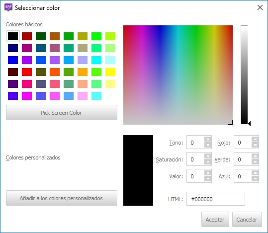 Permite establecer el color frontal y de fondo respectivamente. El primero se aplica, en aquellas herramientas que usan color, pulsando el botón izquierdo del ratón, el segundo pulsando el botón derecho. Ambos muestran los colores activos. Para cambiar un color pulsar sobre el botón que muestra el color; esto abrirá la ventana para la selección de color: