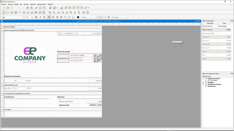 Cuando se quiera crear un informe, se creará una copia de ese fichero con otro nombre y se editará con el comando informe personalizable: editar informe. Una vez diseñado podremos guardarlo en disco nuevamente desde el editor de informes personalizables. Cuando queramos imprimirlo, en los comandos de impresión de informes externos, lo identificaremos por su senda.