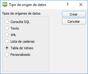 El tipo Tabla de Velneo nos permitirá escoger como origen de datos una tabla de Velneo.