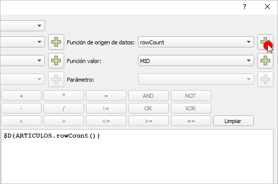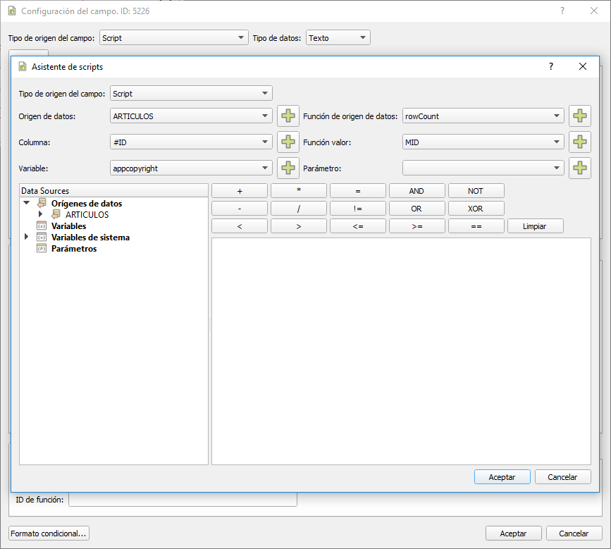 Así mismo tendremos acceso a funciones de origen de datos, funciones de valor (mid, left, right) y a los operadores disponibles para la generación de scripts.