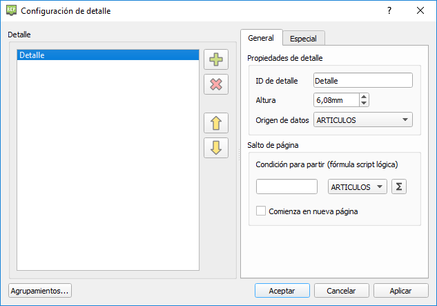 Pulsar “aceptar” para aplicar la configuración del detalle. En la pestaña especial podremos definir un origen de datos secundario en el detalle. Ver el capítulo llamado iteración del subinforme para ampliar información al respecto.