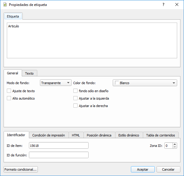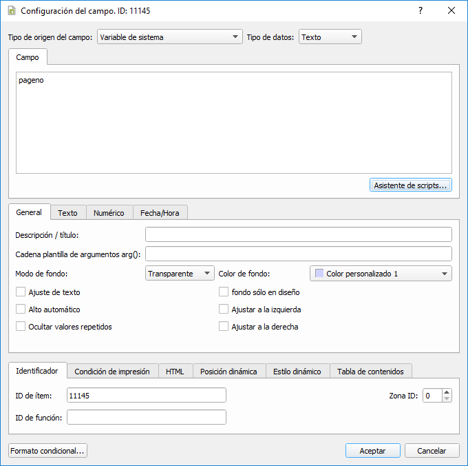 El nombre y tamaño de la fuente especificado serán usados por defecto para las etiquetas de texto y campos del informe. En cada objeto será posible cambiarlos.