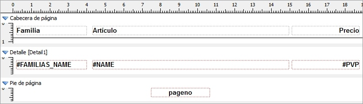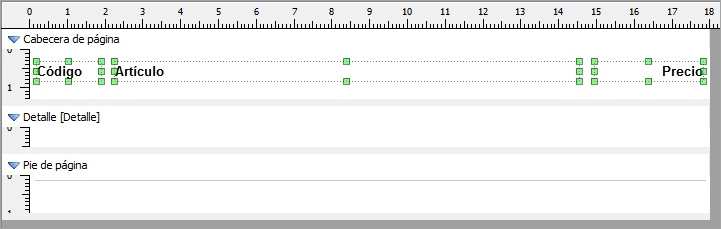 Las casillas de verificación pueden usarse para habilitar o inhabilitar las secciones de cabecera/pie de página de página y de cabecera/pie del informe. Para cambiar la altura de estas secciones podemos hacer uso de los microscrollers correspondientes a cada una de las opciones. También es posible modificar la altura de estas secciones directamente en el editor de informes, usando el ratón.