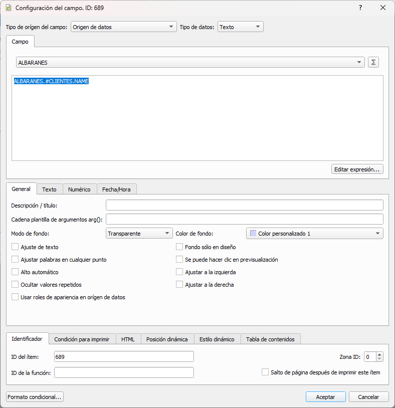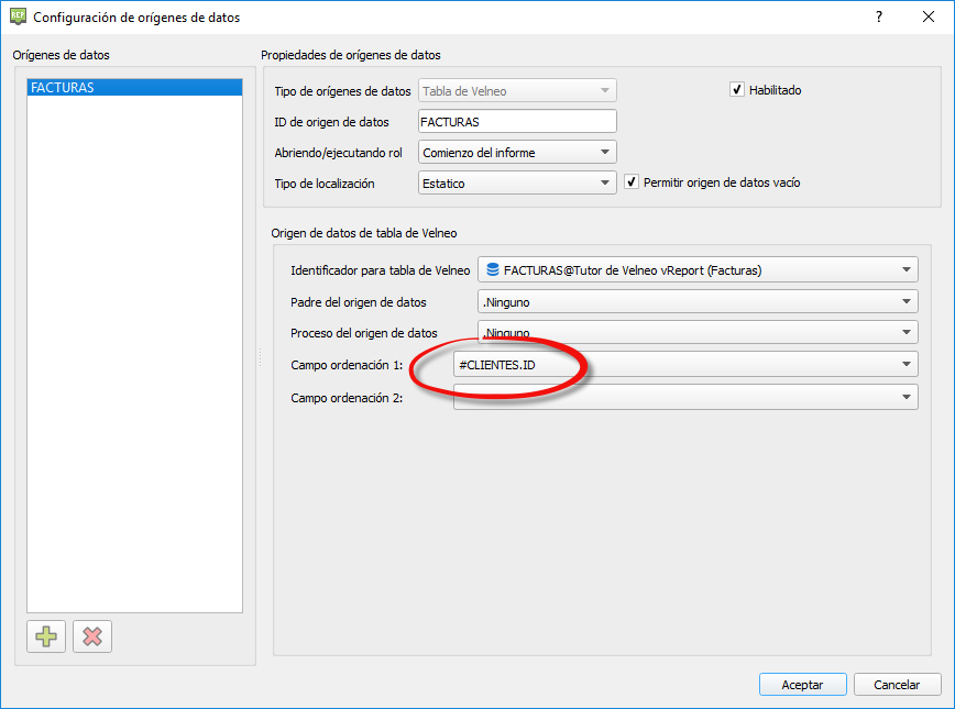 Este combo contiene los orígenes de datos posibles de los que el campo puede obtener la información. Dejaremos el valor origen de datos en el caso de que queremos que sea un campo de la tabla de Velneo asociada al informe.