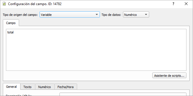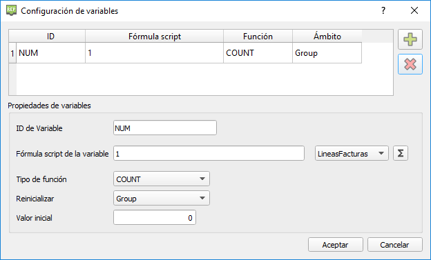 Las variables son unos elementos numéricos especiales, usadas para facilitar recuentos y totales. Cada una tiene nombre, un tipo de función, un tipo de dato y tienen asignado origen de datos de la columna e la que está basada la variable. Para añadir una variable seleccionar la opción variables… del menú informe. Aparecerá un diálogo en el cual podrás gestionar variables.