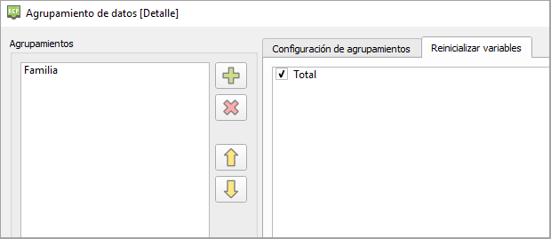 Esta lista contiene las variables de ámbito del grupo. Puedes especificar qué variable del generador de informes debe ser reseteada cuando haya finalizado un agrupamiento.