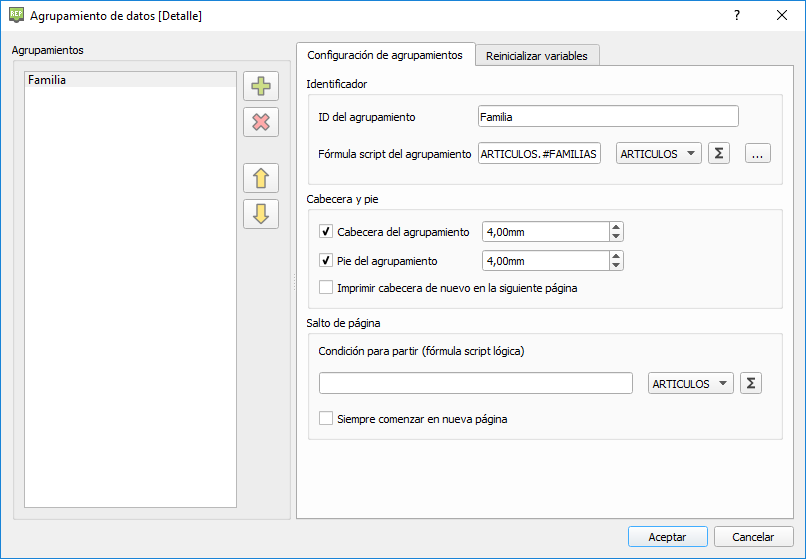 Los informes habitualmente requieren calcular acumulados por agrupamiento. En nuestro ejemplo añadiremos un total de precios por familia. Primero, abrir el menú informe y seleccionar la opción detalle y agrupamientos…, entonces aparecerá un diálogo en el que podemos gestionar las secciones de detalle y los agrupamientos del detalle. Seleccionar el detalle existente y hacer clic en el botón agrupamientos…, aparecerá el diálogo de configuración de agrupamientos. Las propiedades disponibles son: