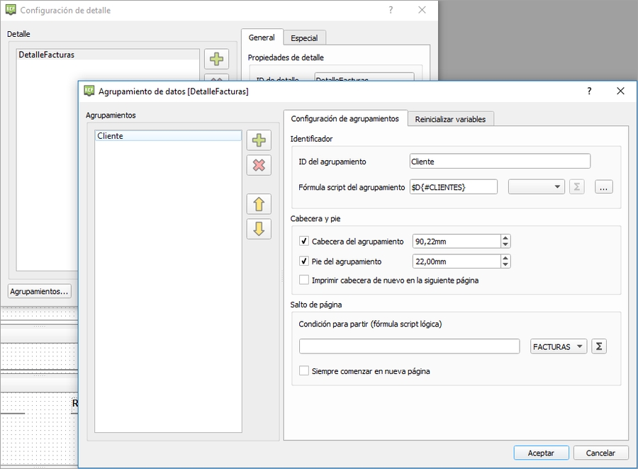 Para aplicar los cambios pulsar el botón aceptar en el diálogo del grupo y luego en el diálogo del detalle. Después de hacer esto tanto el encabezado como el pie del agrupamiento aparecerán.