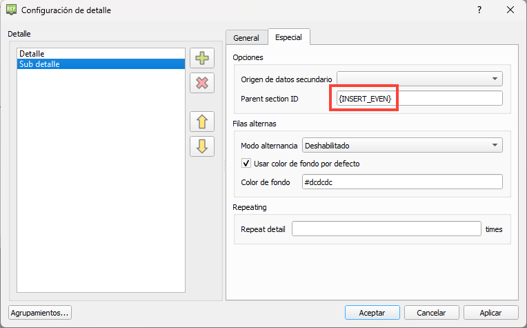 Para añadir una sub-sección simplemente abra el menú Informe/Detalles y agrupamientos... y añadir una nueva sección de Detalle. Por defecto una sección detallada necesita tener una fuente de datos asignada, pero una subsección no. Simplemente debemos establecer el ID de la Sección Padre en la pestaña Especial.