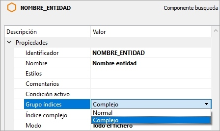 Los componentes del objeto búsqueda ahora tienen un nuevo parámetro “Grupo índices” que permite seleccionar si deseamos utilizar un índice normal o un índice complejo, en función de la selección la siguiente propiedad nos solicitará un índice normal o un índice complejo según corresponda. Una vez definida la búsqueda podrá ser usada como cualquier otra búsqueda de nuestra aplicación. En la siguiente imagen podemos ver la definición del componente.
