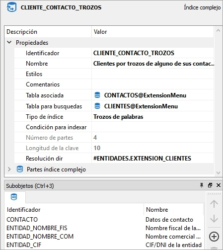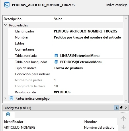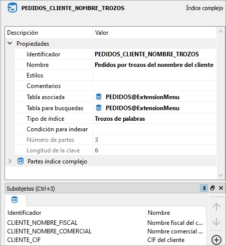 Un índice complejo estará compuesto por una o más partes. Para crear una parte de un índice complejo abrir el menú objetos, submenú nuevo sub-objeto, opción parte índice. Sus propiedades son: