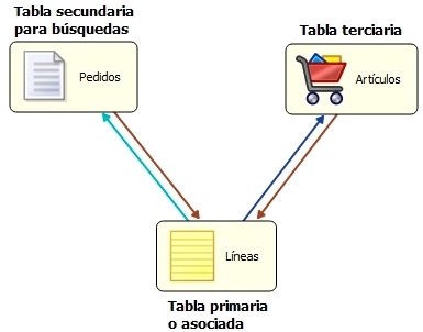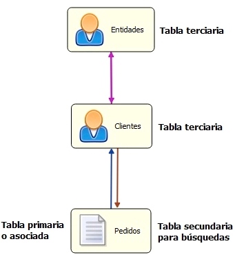 En este ejemplo vemos como la misma tabla, en este caso la de PEDIDOS es a la vez la primaria y la secundaria. También vemos como la tabla de CLIENTES es una maestra de extensión de la tabla ENTIDADES que es donde se encuentran los campos a indexar.