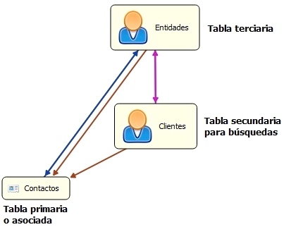 Con este índice complejo queremos buscar clientes por los trozos de su teléfono, móvil, email, fax, skype, etc. y también si el trozo a buscar forma parte del nombre fiscal, nombre comercial o CIF/DNI de la entidad. Para conseguirlo declaramos como tabla asociada (primaria) la tabla de contactos que es el plural de contactos de le entidad, como tabla para búsqueda configuramos la de clientes y luego declaramos las partes del índices a indexar. El esquema de tablas en el que está basado el ejemplo es el siguiente: