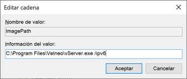 Para configurarlo debemos añadir en el parámetro ImagePath del servicio correspondiente, a continuación de la senda del fichero ejecutable de Velneo vServer el parámetro /ipv6.