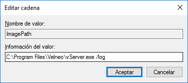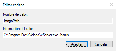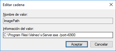 Para configurar el puerto de escucha debemos añadir en el parámetro ImagePath del servicio correspondiente, a continuación de la senda del fichero ejecutable de Velneo vServer el parámetro port: /port=nnnn, donde nnnn es el número de puerto por el que queremos acceder al servidor.
