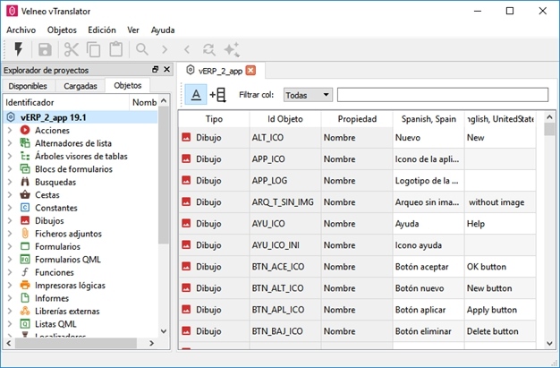 En la pestaña Objetos se muestra la lista de objetos del proyecto cargado agrupados por tipo de objeto y en el panel principal se mostrará una rejilla con la lista completa de recursos a traducir:
